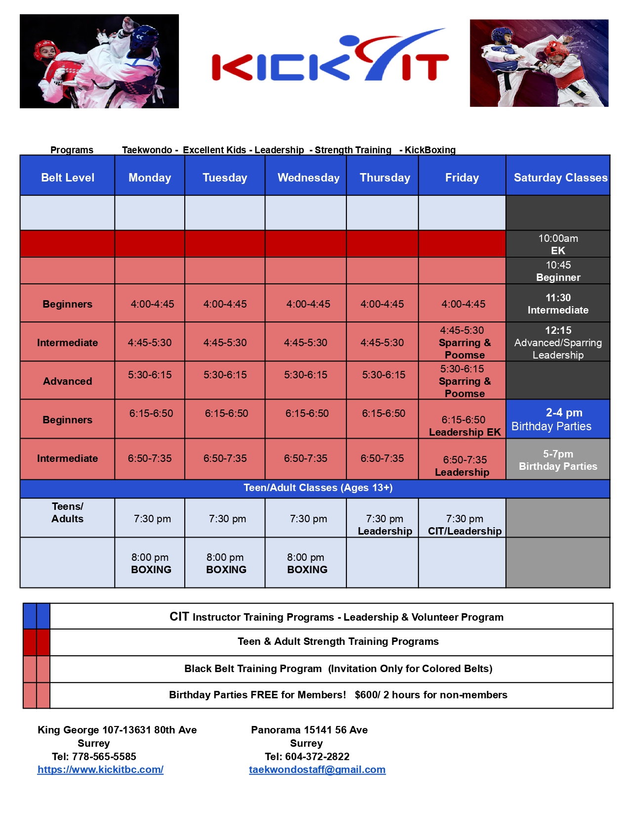 Fees: 1st Dan $550, 2nd Dan $650, 3rd Dan $750, Boot Camp $225 Teacher Training- speak to Kick-it rep.